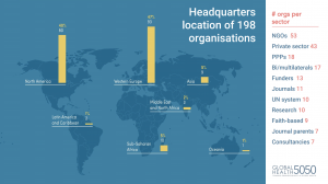 From Equality Works: The Global Health 50/50 2019 Report. Headquarters location of 198 organisations active in global health, 2019.