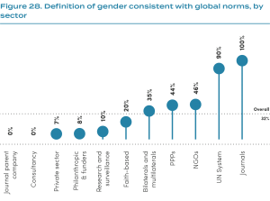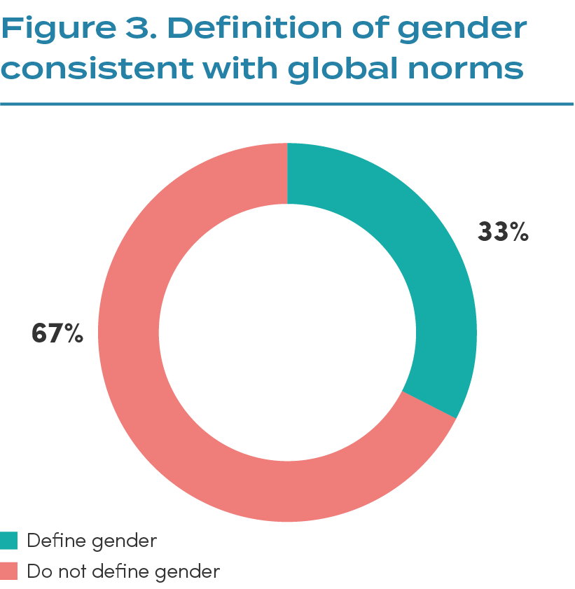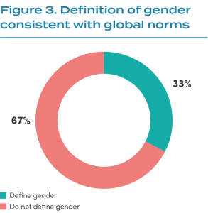 Just 33% of organisations define gender in a way that is consistent with global norms (see glossary for definition). An additional 11% (21/198) of organisations mention gender-related terms (e.g. “gender diversity”) but do not provide any definition of gender in their work.