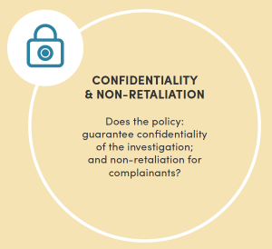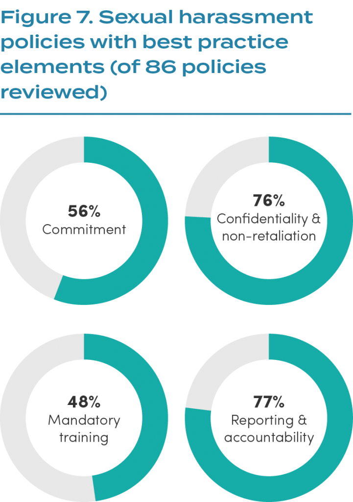 Across the four best practice elements, a majority (77%) of organisations outline procedures for reporting and investigation of cases of sexual harassment, and three quarters (76%) guarantee both confidentiality and non-retaliation.
