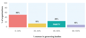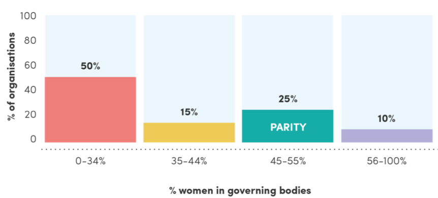 One out of four organisations have parity on their governing bodies. This marks an improvement from 2018, when one out of five organisations had parity on their governing bodies.