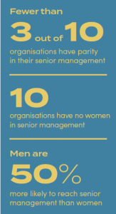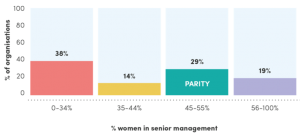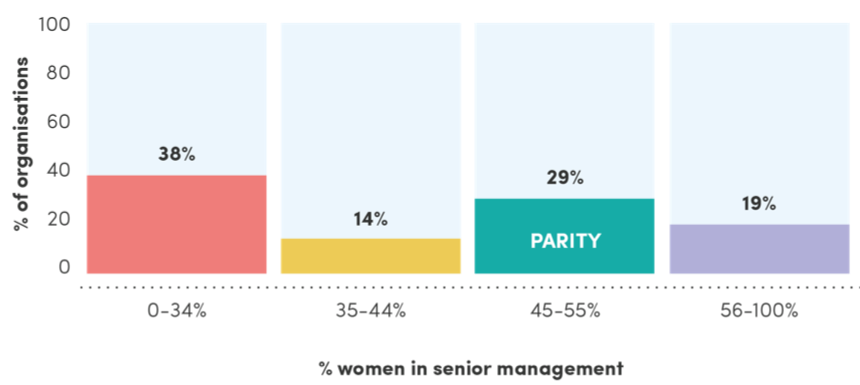 Three out of ten organisations have parity in their senior management. In four out of ten organisations, fewer than one third of senior managers are women.
