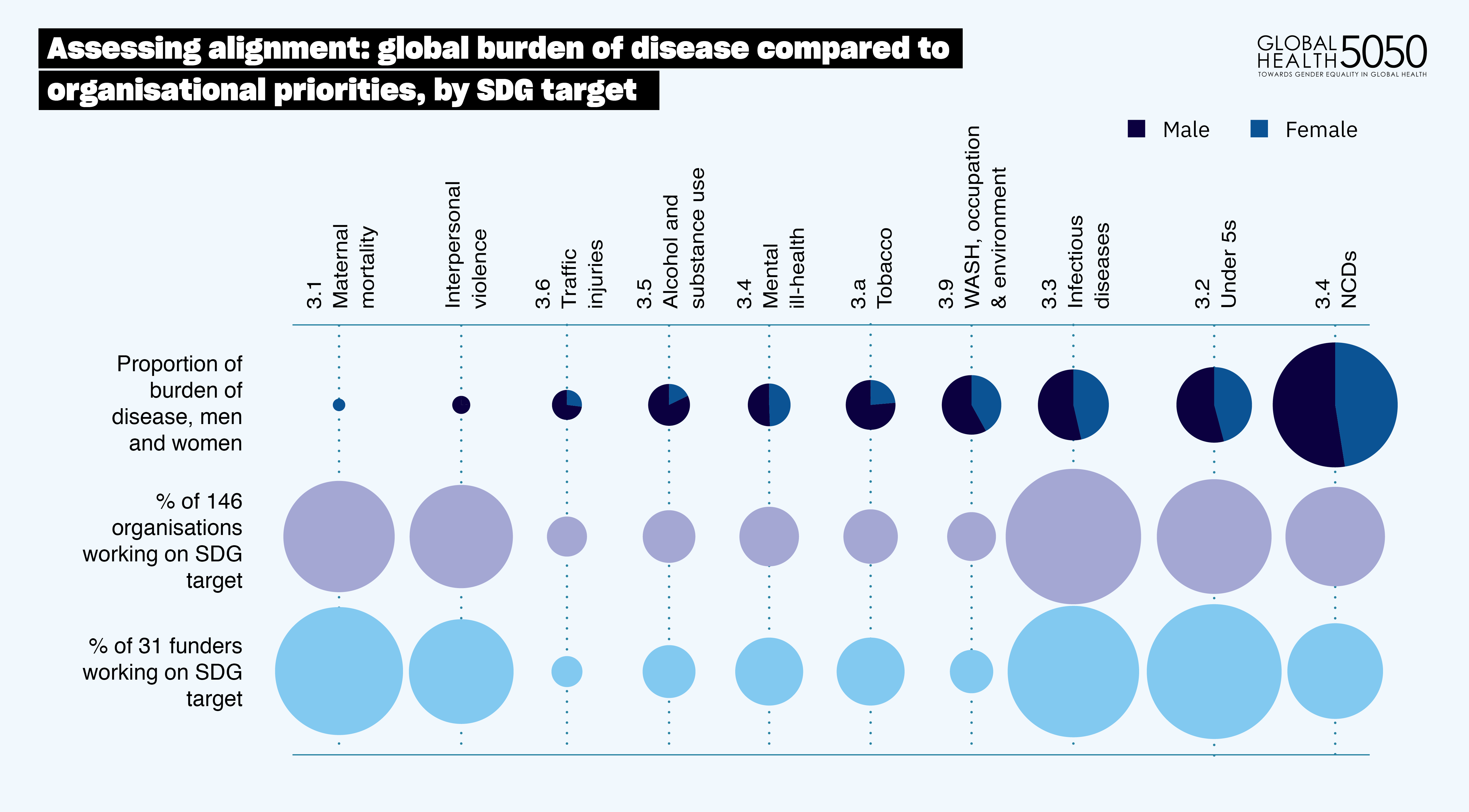 An analysis of the health-related priorities of the organisations in our sample, however, reveals notable gaps. We find a startling mismatch between organisational attention and burden of disease. Maternal and child mortality and infectious diseases continue to receive the most attention, issues which were predominant in the era of the Millenium Development Goals (MDGs; 2000-2015). The SDG targets for 2030, particularly NCDs, are not receiving proportional attention from funders or other organisations. This is despite the fact that NCDs cause the most premature deaths globally.