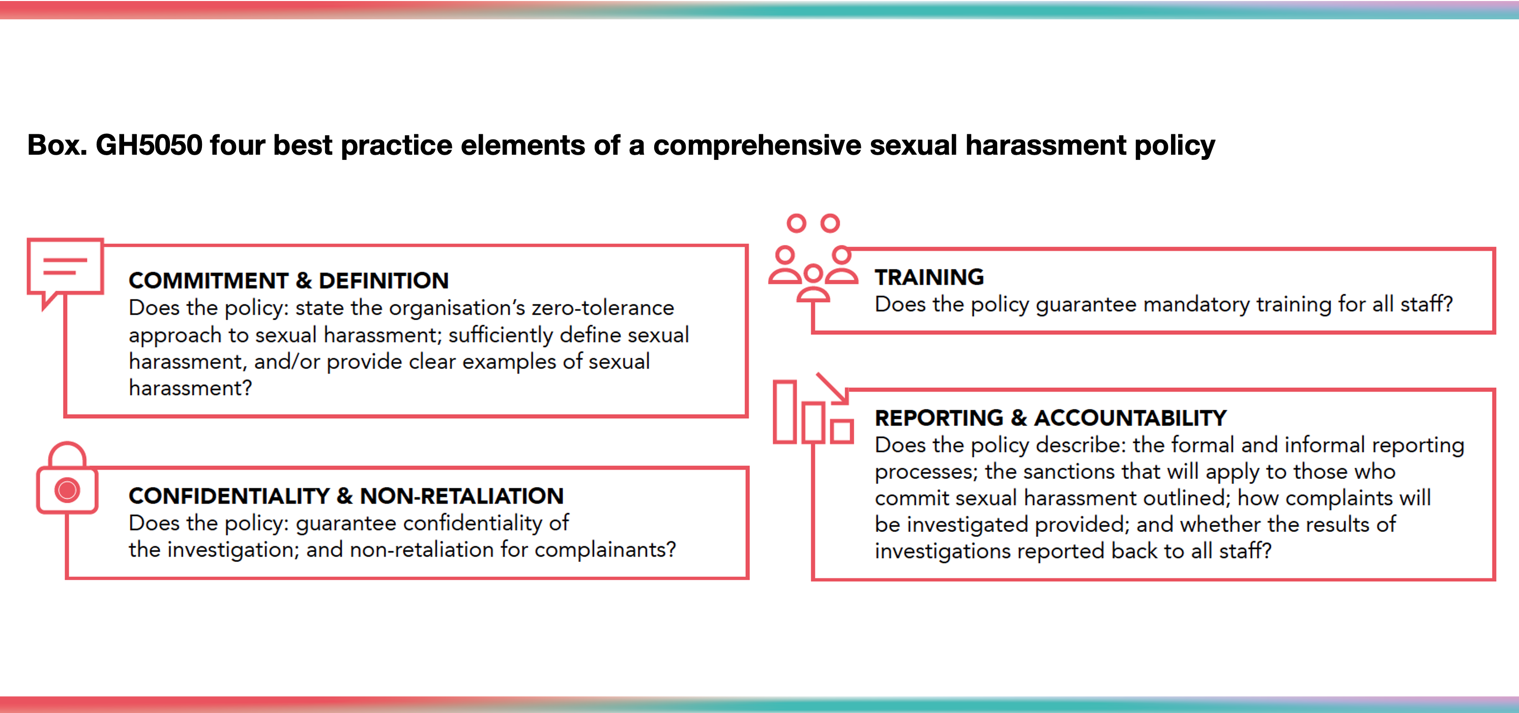 A comprehensive policy is a fundamental tool to prevent and address sexual harassment and to contribute to the creation of a work environment that is based on dignity and respect. Drawing on good practice as well as existing global norms (including the UN model policy), a range of public and private sector guidelines and peer-reviewed publications, GH5050 identified four elements of a comprehensive sexual harassment policy (see Box).