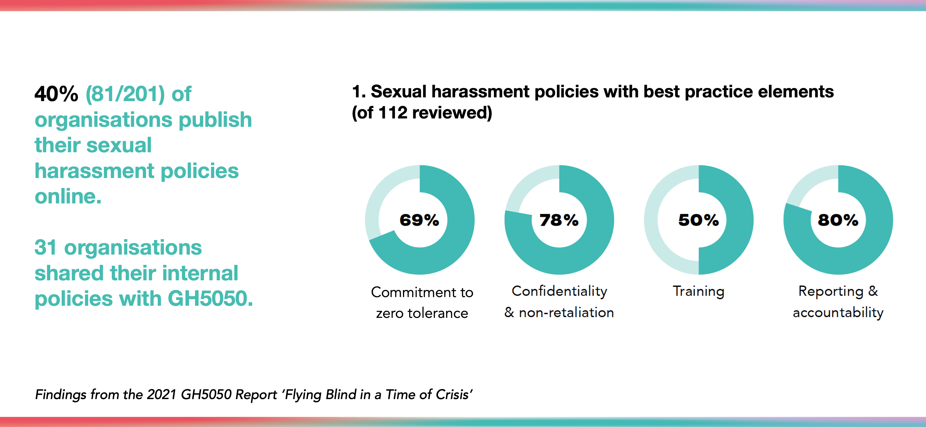A large proportion of policies have some elements of best practice content in terms of: 1) descriptions of reporting and investigation processes (80%); 2) protections regarding confidentiality and retaliation (78%); and 3) state a zero-tolerance approach alongside defining and providing examples of sexual harassment (69%). However, only half (50%) stipulate mandatory training on sexual harassment for staff. For examples of organisational policy language on each of these elements, see page 69 of the 2019 Global Health 50/50 Report.
