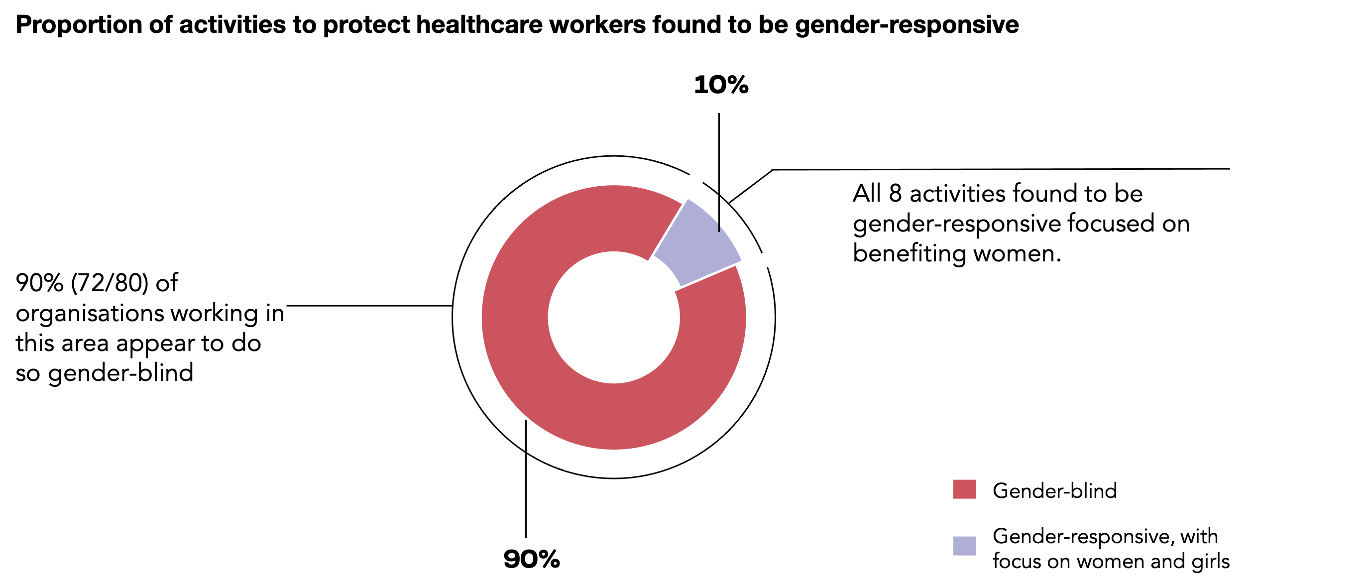 Among these 80 organisations, 10% (8/80) described their activities with some level of gender-responsiveness while 90% (72/80) were gender-blind. Gender-responsive language included a recognition of the disproportionate risk of infection faced by women community health volunteers and directly targeting them with PPE provisions, and recommendations for policy-makers and investors on key gender responsive actions to be adopted in programmes targeting the health workforce.