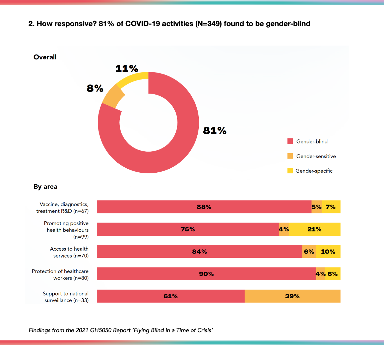 The majority of the 349 activities reviewed were found to be gender-blind - i.e. gender was not taken into account in the programme or policy reviewed - ranging from 60% to 90% across the five areas. Gender-blind approaches were seen most frequently in the following areas: 1) vaccine, therapy, and diagnostics R&D; 2) treatment of health services; and 3) protection of healthcare workers.