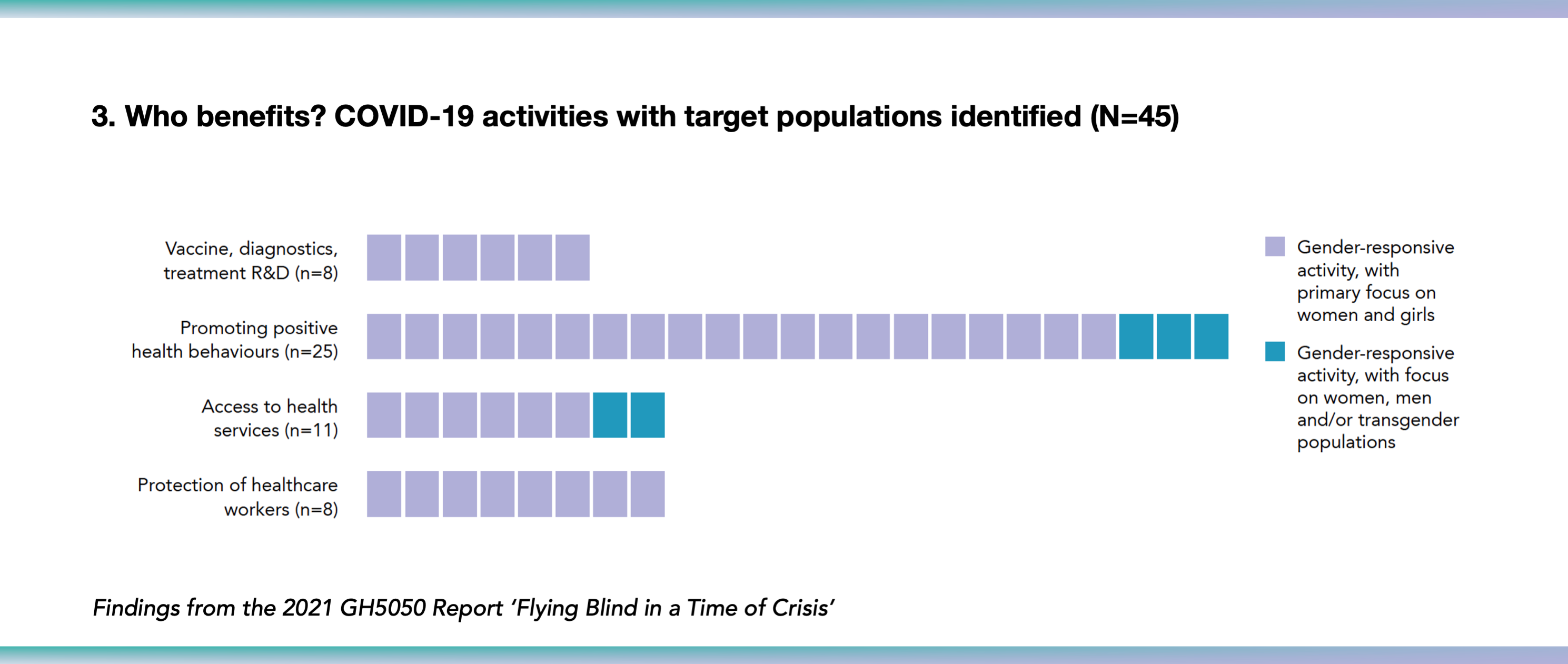 “The focus should be on gathering more evidence for targeted decision making. The [GH5050] report is a great starting point for that. Organisations can no longer avoid gender in their responses if we want to achieve an equitable recovery to the pandemic.”
